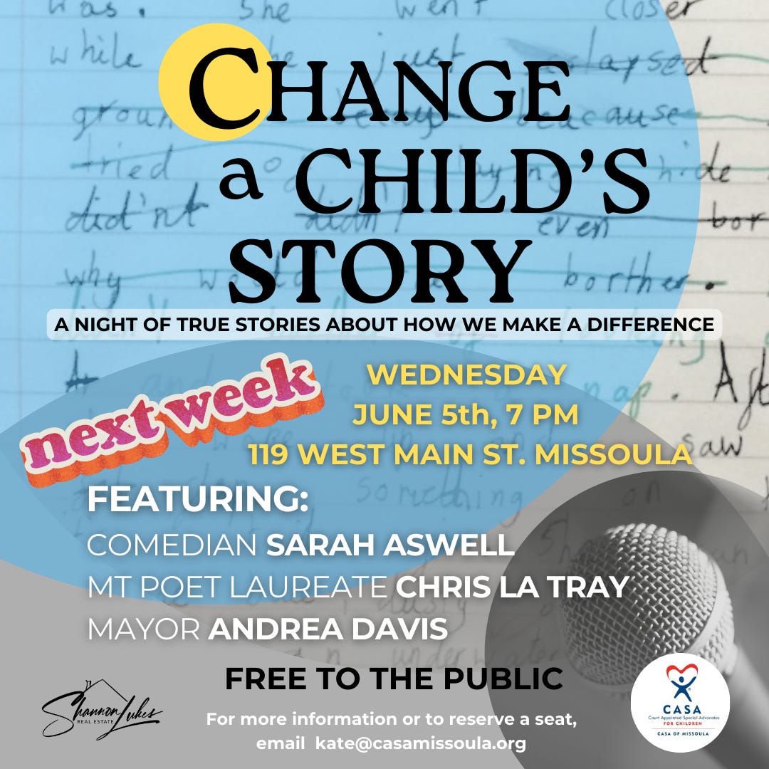 I’ll be speaking for ten minutes, give or take, in support of CASA of Missoula, this coming Wednesday, June 5th, at 7PM.