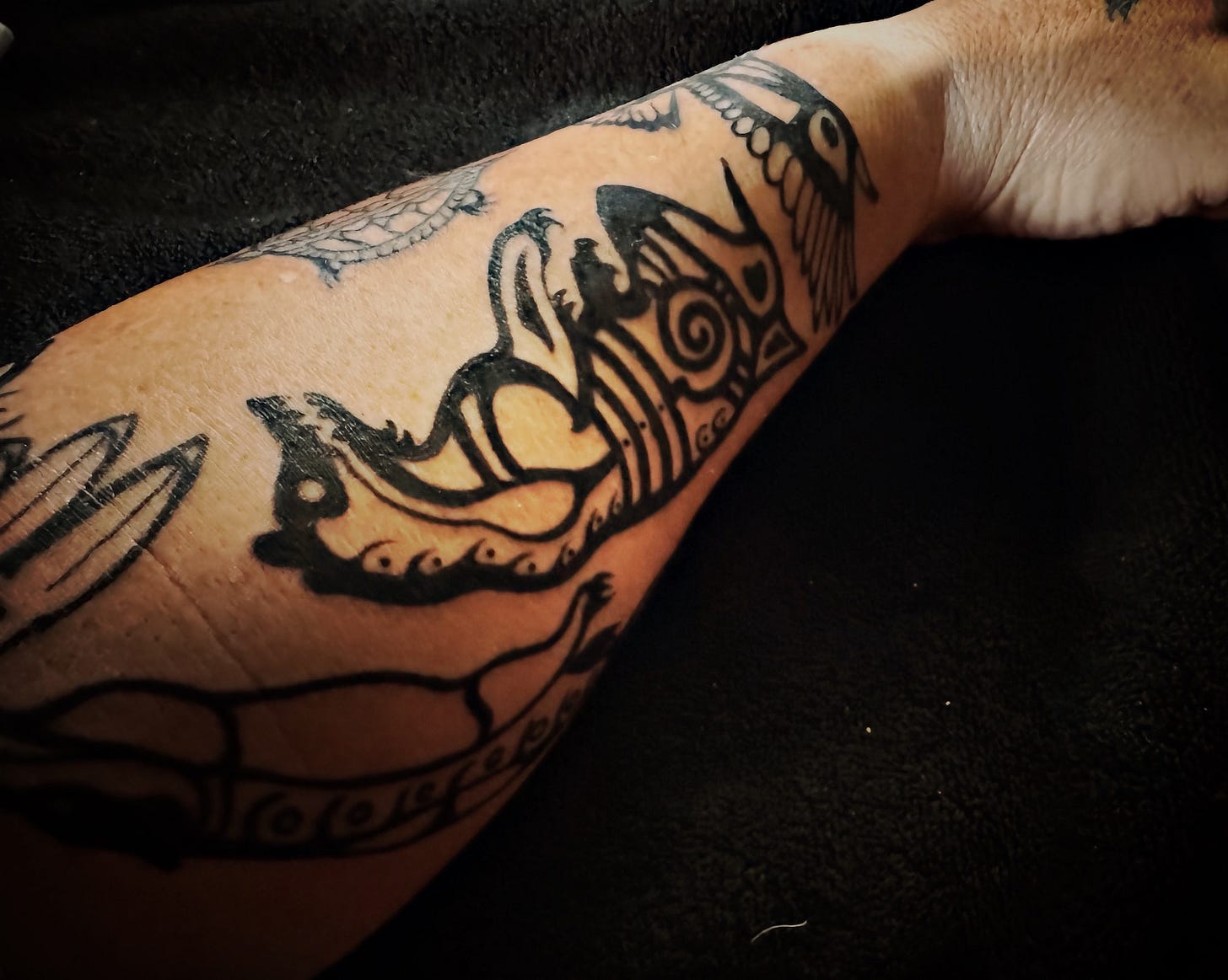 2024_0528: “We suffer to prove our devotion” is the mantra as hours six, seven, eight, and nine roll by in service to the Seven Grandfathers from a chair at Blaque Owl Tattoo.