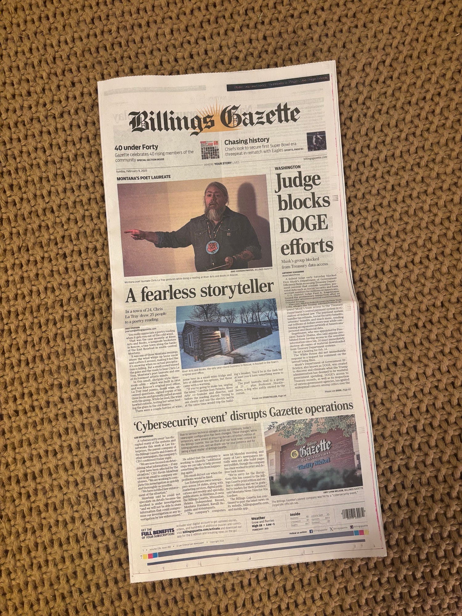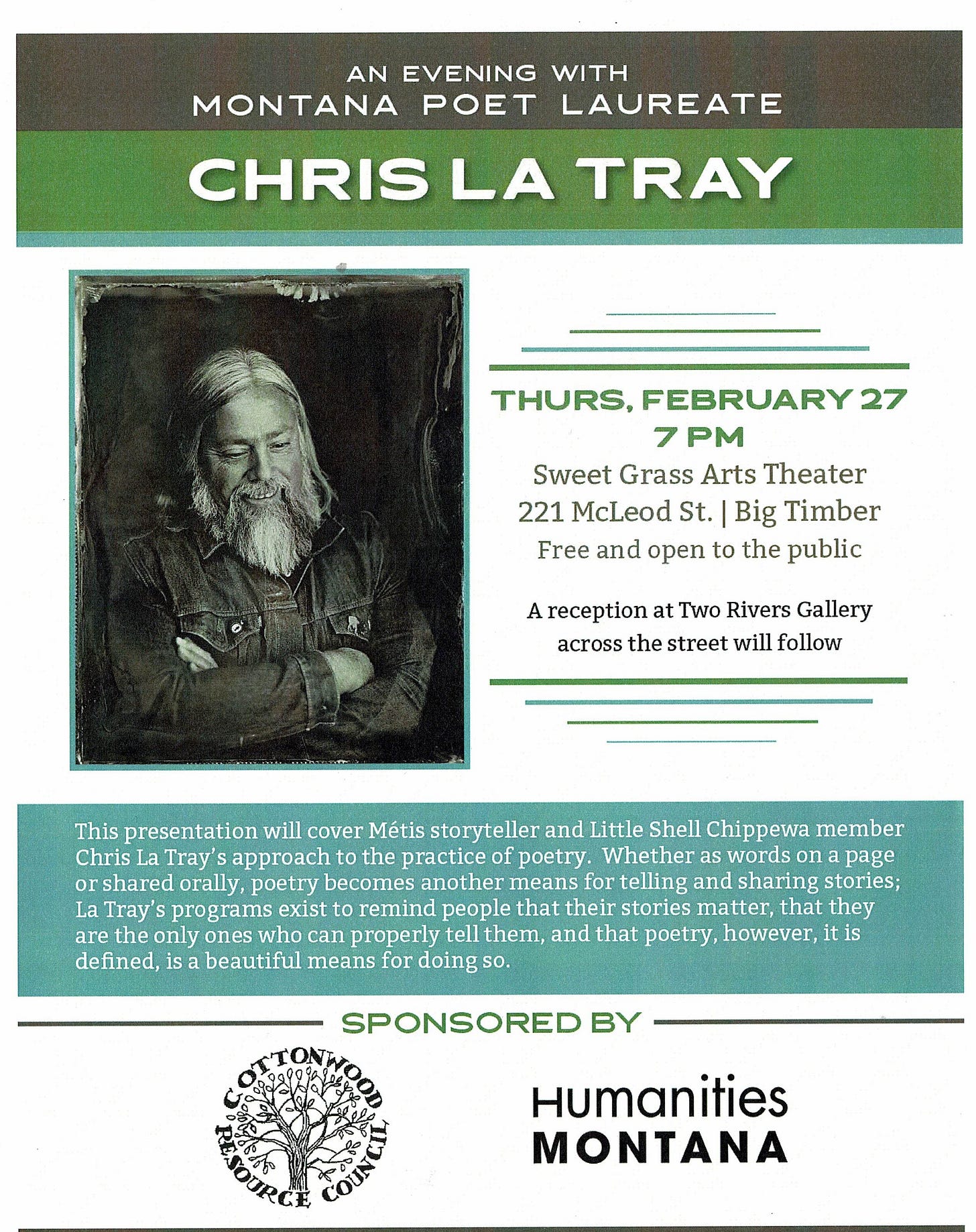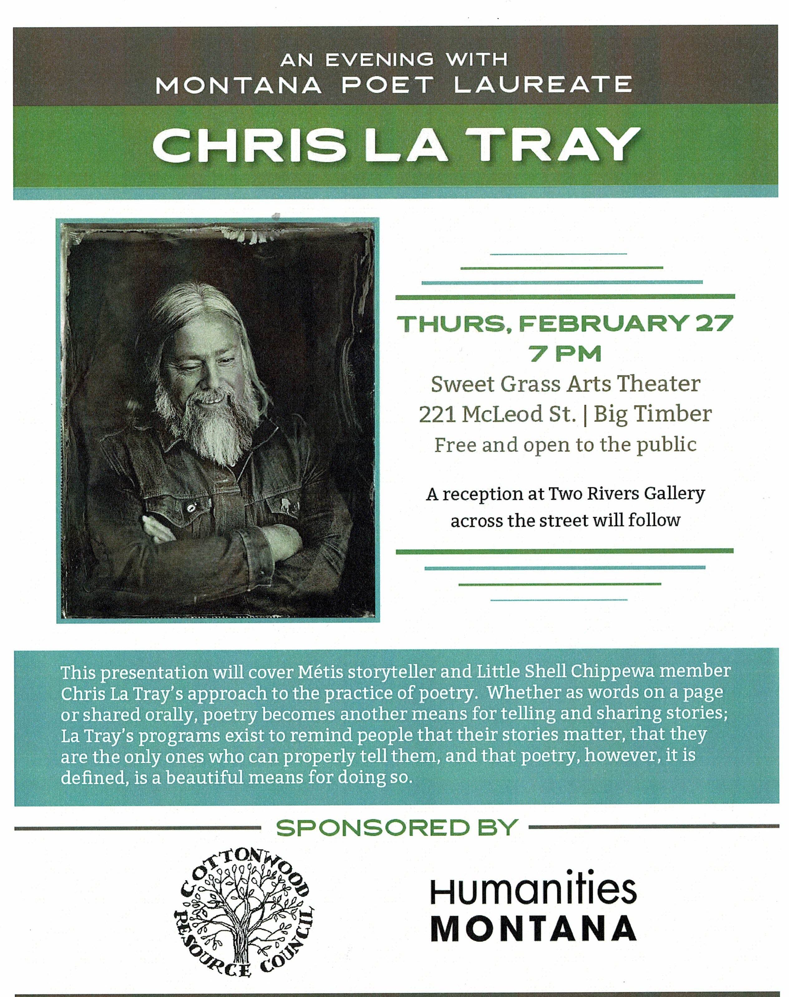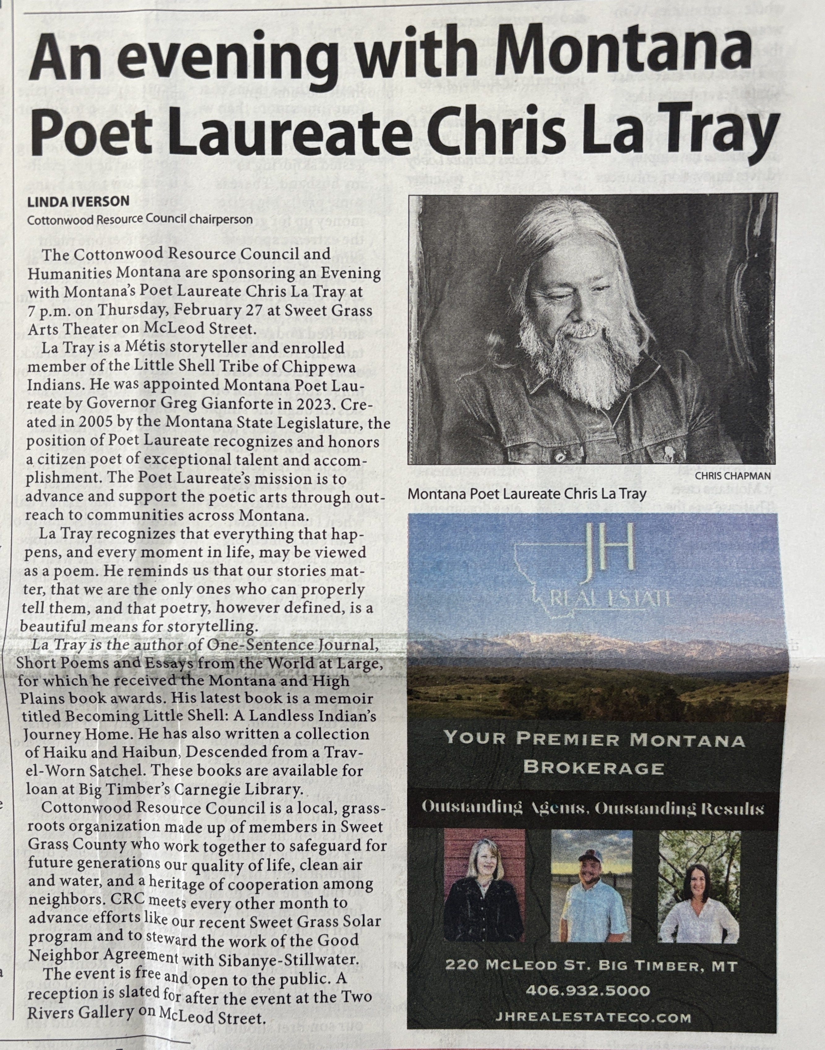Ideally, one shares a flyer before an event but I never did for this one. But that didn’t matter, because the town of Big Timber showed up for an event just a couple nights ago. I even sat down at the Timber Bar for a pre-event ribeye and the bartender, after taking my order, turned and asked, “So, are you that poet guy?” and I said yes, yes I am. Officially now the MTPFLG, to be specific.