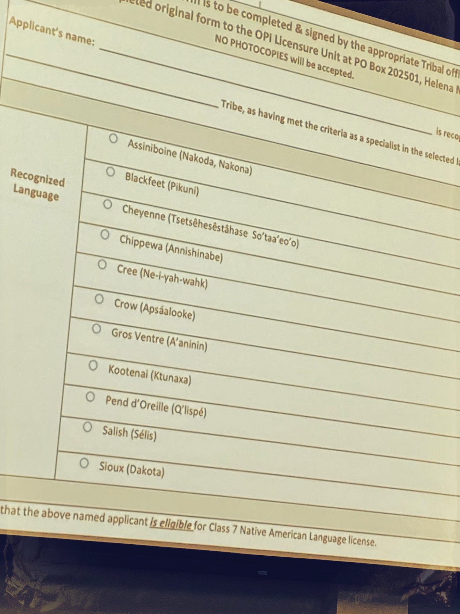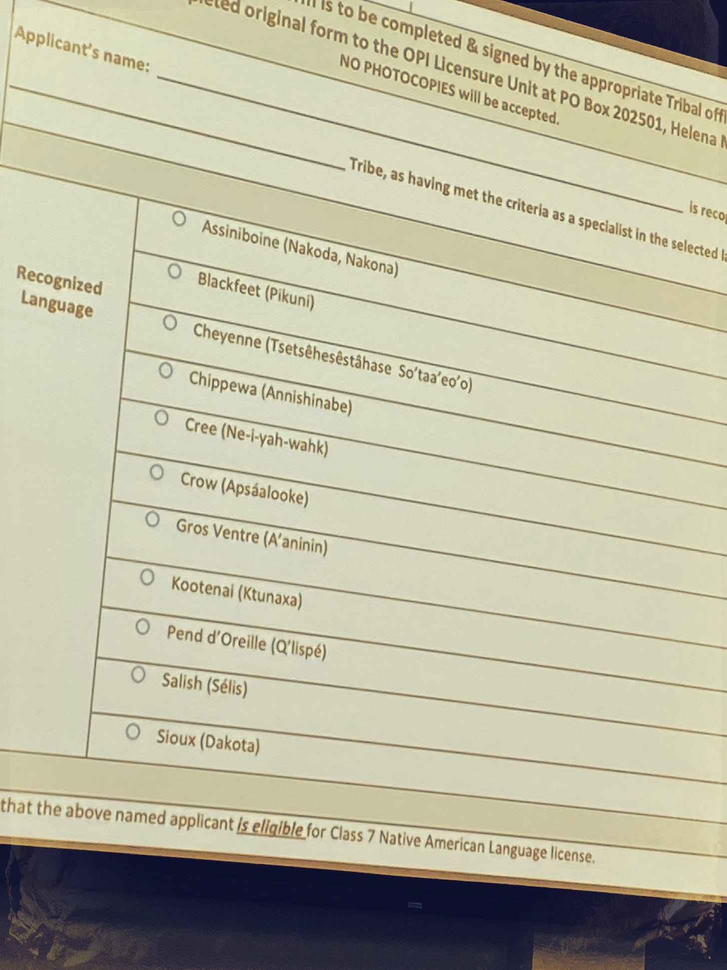 The tribes in Montana are divided up onto eight reservations1 encompassing a dozen tribes speaking eleven languages. The following image is a photo of a slide from a presentation that lists those languages.
