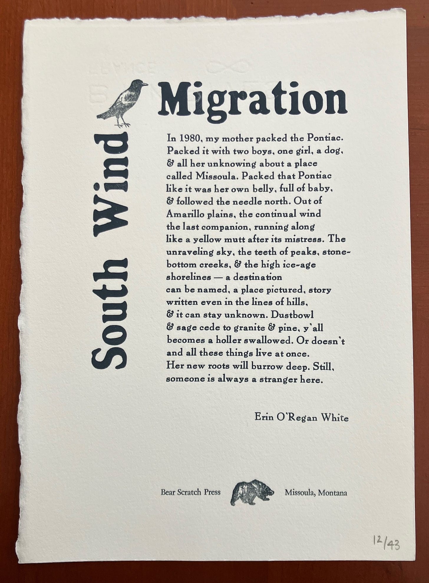 A poem to celebrate my friend Erin O’Regan White! I met Erin through Freeflow back in 2019 and we’ve been friends ever since; she received her MFA in poetry last year from the University of Montana. She also just won the 2024 Merriam-Frontier Award, has had a Pushcart nomination, a 2021 Best American Essays notable mention, and was the editor of CutBank for a couple issues, including, for the first time ever, an all-Indigenous one (#99) that included one of my poems. I remember sitting with her discussing the idea of that particular edition on a sunny afternoon on campus more than a year ago and it was great to see it come to fruition. Anyway, for her reading to celebrate the award, Erin printed up a pile of broadsides of this lovely poem, which I share here for all of you to enjoy as much as I do….