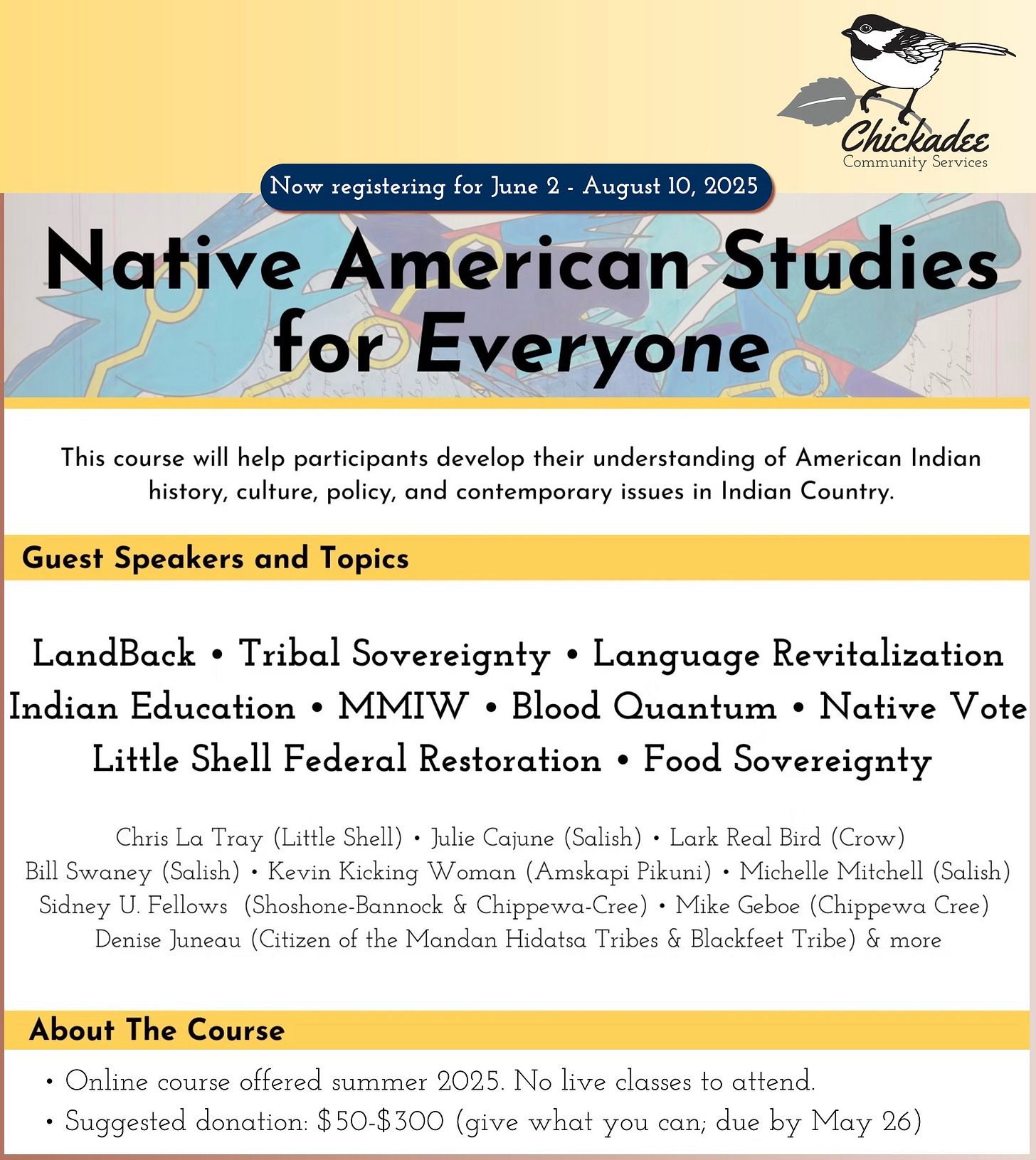 I’ll be pressing for this more in the coming weeks and couple months, but if you missed the first edition of Native American Studies for Everyone via Chickadee Community Services, which is at its halfway-to-completion point right you, you may sign up for the next round that runs June 2 – August 10. Details and such may be found HERE. This is nowhere near my project but I’m pretty involved with it and I encourage as many people as possible to participate.
