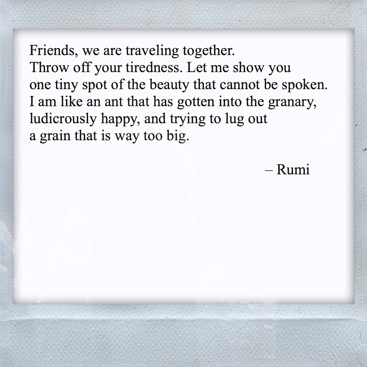 Finally, another book I’m reading an entry from every day is this one, A Year with Rumi: Daily Readings by Coleman Barks. Don’t come at me with all the controversy with Barks’s translations, I know about them and, this year at least, I don’t care. When Mary Oliver died a few years ago, this wonderful little profile ran in Parabola. In it we learn Barks was Mary’s friend, and that she began every day reading one of the entries from this book. So if it was good enough for Mary, I decided, it would be good enough for me. Probably at least half of the daily readings are beyond my capacity to understand, but just the other day was this one … and I love it.