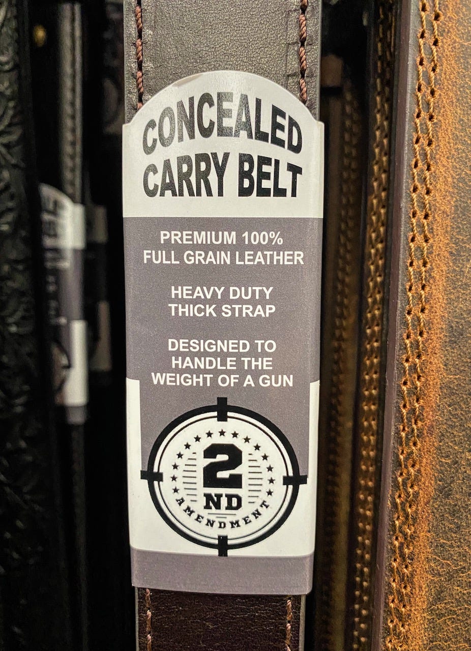 It reminded me of my Kalispell visit at the beginning of the month. When I was unpacking in my hotel room after arriving, I realized I’d forgotten my belt and there was no way I was going to get through two days without it. So I went to the local regional chain store where I knew I could get one; you know, the one that sells feed and tools and “western wear” and the like. There, among the belt options, was this lovely specimen: