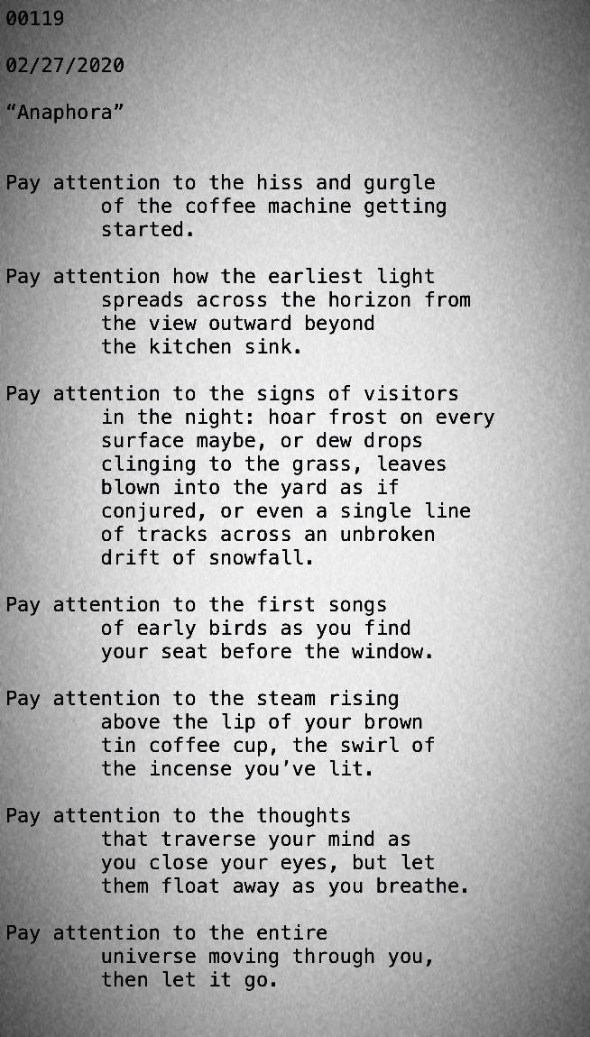 Here is a poem I recently transcribed. When I do this, I note what number the poem is in the series, the date, what the prompt was (in this case “Anaphora”) which, quite often, the poem has nothing to do with, and then the raw lines right from the notebook. Ones I like I copy to another folder to go back to at some point to edit. Or not. This one … I don’t know. I just liked it when I transcribed it. You might like it too.