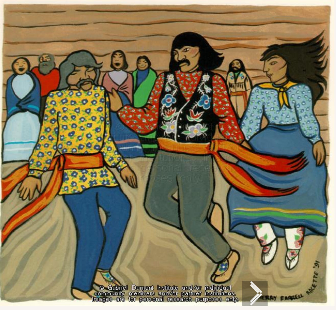 Métis people were known for “bush dances.” While the idea conjures an image of a bonfire in a clearing with naked shapes cavorting around it, this was not that. Instead, it would be someone’s remote cabin or the like, and folks would venture there to celebrate. Holidays, a marriage, or even just the joy of being alive. Wooden boards or planks might be spread out on the ground outside or, in inclement weather, the furnishings indoors might be pushed to the outer edges of the room to make space for a dance floor. There would be fiddles—there are always fiddles in Métis celebrations—and various other kinds of noise-and-rhythm makers. There would be laughter, singing, and wild, sweaty jig dancing. Certainly there would be flirtations.