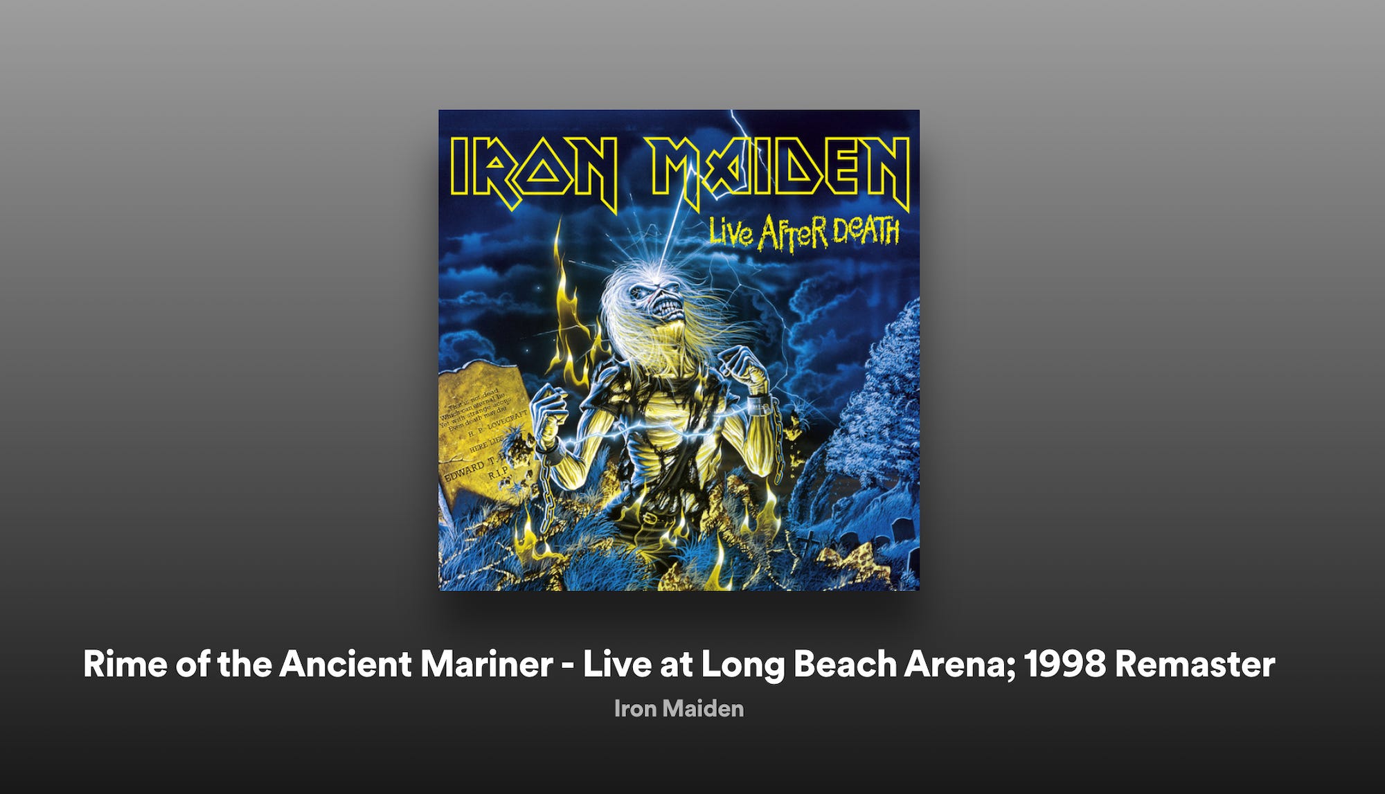 I landed on "Rime of the Ancient Mariner," the live version. It's an adaptation of the Samuel Taylor Coleridge poem from a couple hundred years ago and I have to say I much prefer Maiden's version; bassist Steve Harris, the band's primary songwriter, did a wonderful job in adapting a long and tedious poem for consumption by fans, like me, who loved the band for their storytelling.