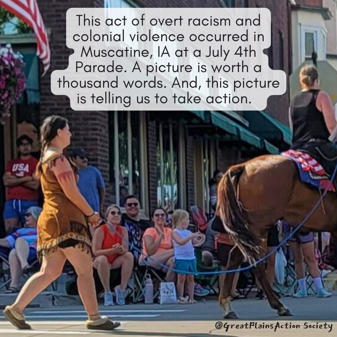 Which brings us to this nightmare that went down in Muscatine, Iowa at a 4th of July parade. Maybe it crossed your radar via social media. It came to me because I take emails from the Great Plains Action Society. Basically a (white) woman in an Indian costume was tied up and led behind a horse as part of their parade depicting … what? The folks at the GPAC do a fantastic job taking on all the ways this depiction is hateful and racist via a letter addressed to the Muscatine Chamber of Commerce, which I urge you to read HERE. This is the closing paragraph of the letter, and it gets to the heart of the issue: