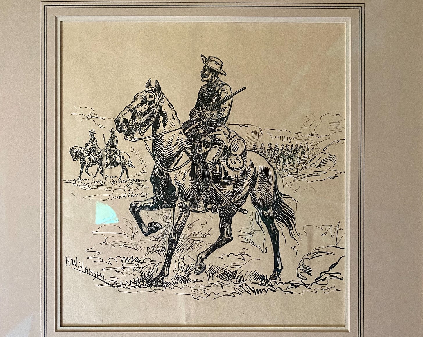 Last month, the morning I arrived at the fancy ranch where a dozen-or-so other Indigenous folks and I, plus a contingent of park service-related folks, would spend two-and-a-half days discussing how to increase awareness toward Indigenous people and presence in Yellowstone National Park, staff there – called “Wranglers” – delivered our bags to our cabins while the rest of us had breakfast and began our meeting. After those first couple hours we had a short break to go see to our accommodations before returning to the main lodge for lunch and more meetings. From what I gather, every cabin has a theme. My gear was ensconced in “The Hunting Cabin.” Decor included a couple vintage outdoorsy posters in frames. You know the type, like the covers of old Field & Stream magazines, or the art inside a Famous Dave’s BBQ joint: lots of buffalo plaid, bird dogs, rosy-cheeked white kids out with their dads huntin’ and fishin’, etc. In this case, there was a poster for some shot gun shell manufacturer, then another one for Winchester rifles and cartridges. On the top of the dresser was a coffee table book about cowgirls. I’m not complaining, the room was nice enough, in its predictable, every-bougie-Western-trope-imagineable way. At least there were big windows that offered spectacular light which, after being opened, also invited the relaxing sound of a gurgling creek just outside into the room. But on the wall beside the bed was this image: a U.S. cavalry troop out on a landscape which could be the Southwest, or could even be the sage-covered, rocky-and-hilly terrain just outside from where I stood gaping at the thing.