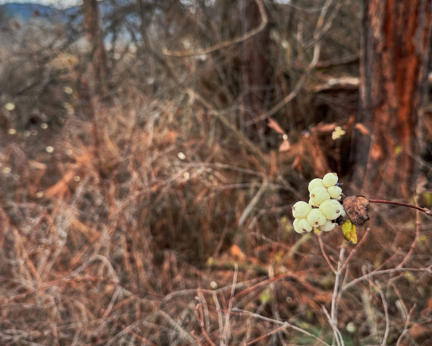We also don’t have so much as a trace of snow yet here where I live, though the stark line of it is creeping down the surrounding hills. Ch-paa-qn looked particularly beautiful in her winter ensemble yesterday under a bright blue sky, and that was lovely to see. I expect winter will finally arrive about the time we are desperate for spring, a newish, yearly herald of more change to deal with: the growing evidence of irrevocable climate disruption. “The flow of the river never ceases,” wrote the 13th century Japanese hermit, Kamo no Chōmie, “and the water never stays the same.” As then, it remains now, change just happening faster and faster.