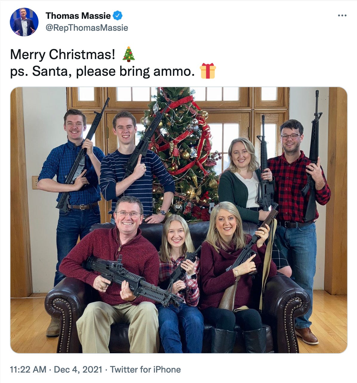 It horrifies me, particularly considering the context. Even as I was looking at this image, my timeline was full of images of people in Oxford, Michigan, turning out in droves in solidarity with the families of the children murdered at Oxford High School just a few days prior. Also in Oxford another gun-loving family is in jail—father, mother, and the son who did the shooting—for being responsible for the latest murders. Now these clueless people, this Massie “family,” are posting their “happy” image while so many people remain in shock. What a vomitous collection of pasty-faced garbage they are.