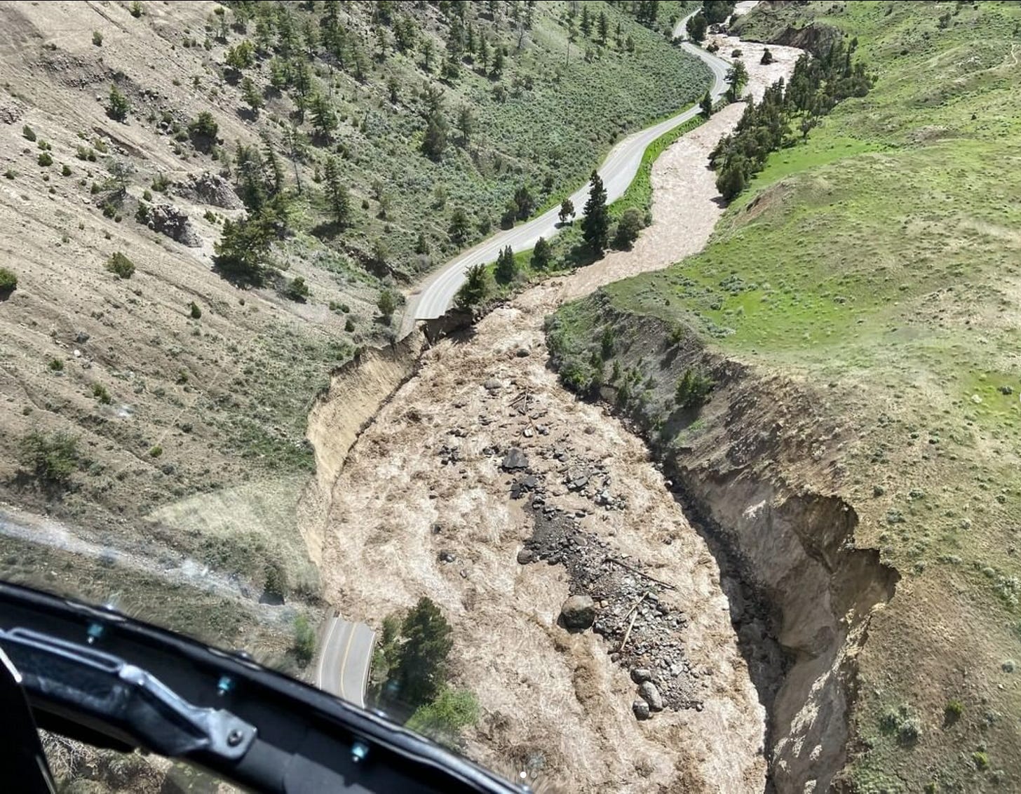 - Aerial assessments conducted by Yellowstone June 13 show major damage to multiple sections of road between the North Entrance, Mammoth Hot Springs, Lamar Valley and Cooke City, Montana.