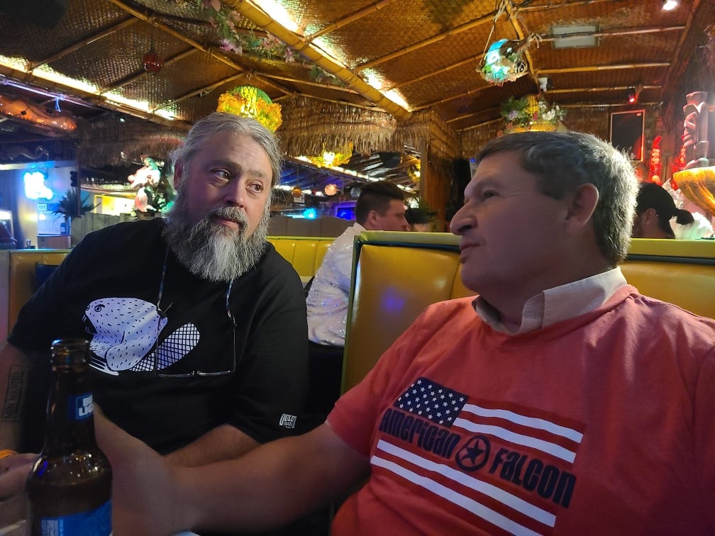 Chi-miigwech in advance for participating in the governing of our tribe. We have a long way to go, and there is so, so much to do. I don’t have a picture of Alisa, but I do have this sweet one she took of me and our tribal chairman, Gerald Gray, at the legendary Sip n’ Dip in Great Falls, in the sweaty wee hours following a pummeling show delivered at the Newberry by the dread American Falcon. Look at Gerald’s shirt! It was his birthday!