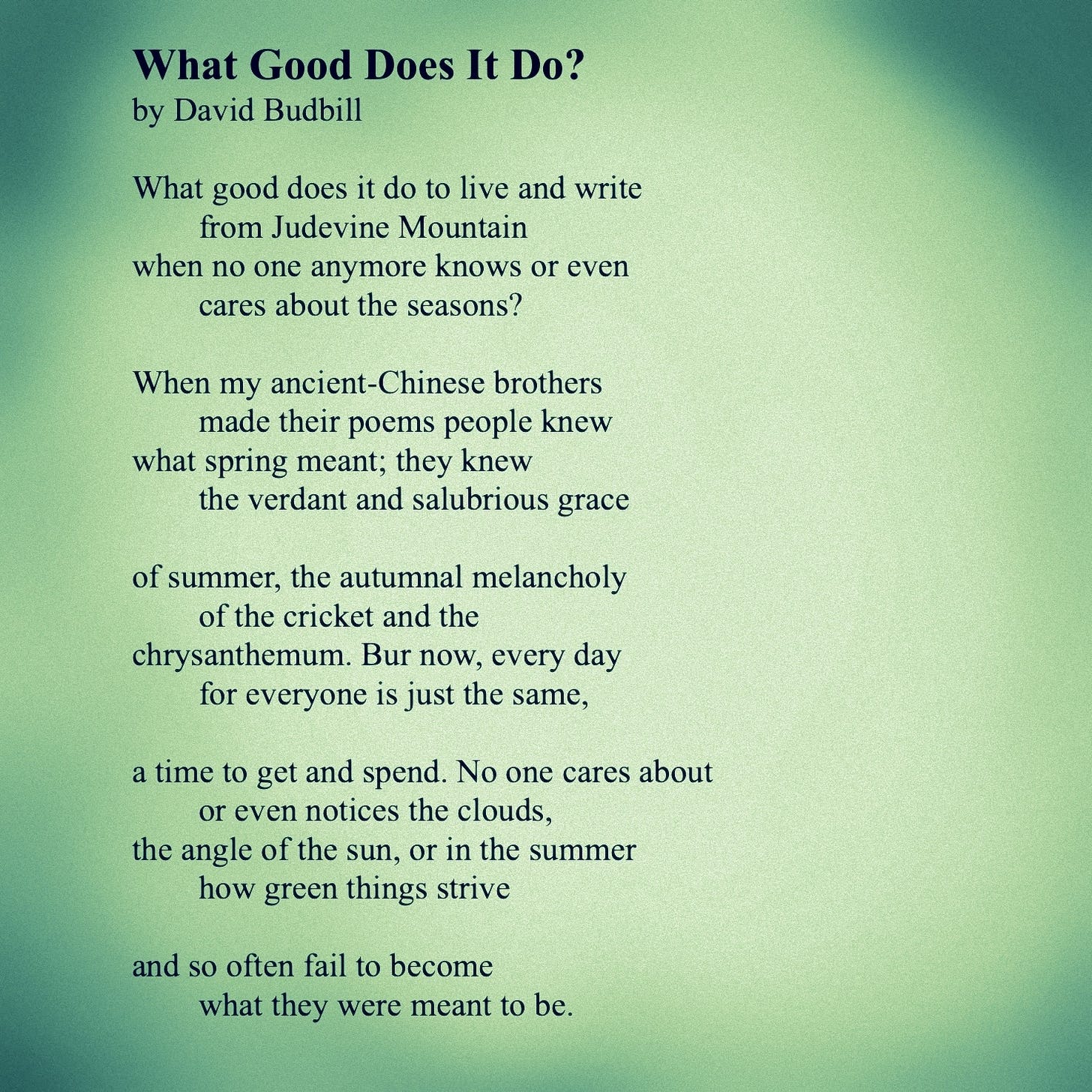 But this post isn’t about David Budbill; I mention him because stumbling across his book on an island in Washington was something of a life preserver to me at a time when I needed to reconnect back to something grounding and important to my day-to-day existence: the connection with – and especially the expression of such through writing – the important simplicity of a place among the wider, older than human world. And of living at a slower pace! Budbill was similar in that he craved that in his life too and found an artistic connection to the ancient Chinese poets who shared this existential need (and also wrote about it), something that I believe we all require and are largely drifting from. Being pulled from, more-like, by the determined and dedicated efforts of a myriad of soulless distractors. Budbill expressed his need for how he wanted to exist through his work and his poetry in the truest sense. As our mutual Japanese friend Bashō was quoted saying: “Real poetry is to lead a beautiful life. To live poetry is better than to write it.” My impression is that that was Budbill. Or at least who he tried to be.5