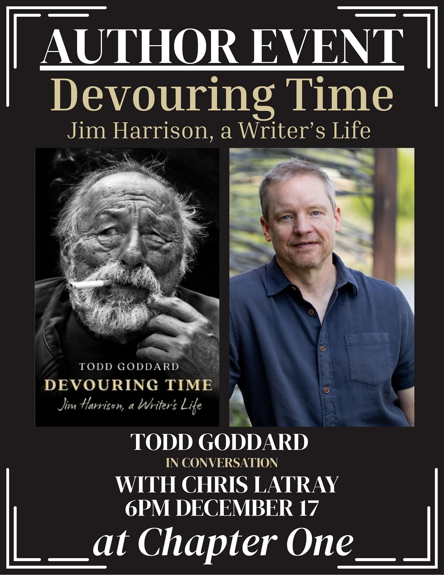 This coming Wednesday, December 17th, I’ll be joining author Todd Goddard to discuss his monumental biography, Devouring Time: Jim Harrison, a Writer’s Life. Harrison has played an enormous role in my emergence as a writer but not, and gratefully considering this book, as a role model. I met Goddard briefly last summer and we hoped for an opportunity to discuss his book together and now we’ll be able to. I have so many questions! I think this one will be worth your time to come hang out with us and I’d love to fill the place not just for the visiting writer but for my good friends at Chapter One Books. They are really doing a great job building a book loving community down there and I love it.