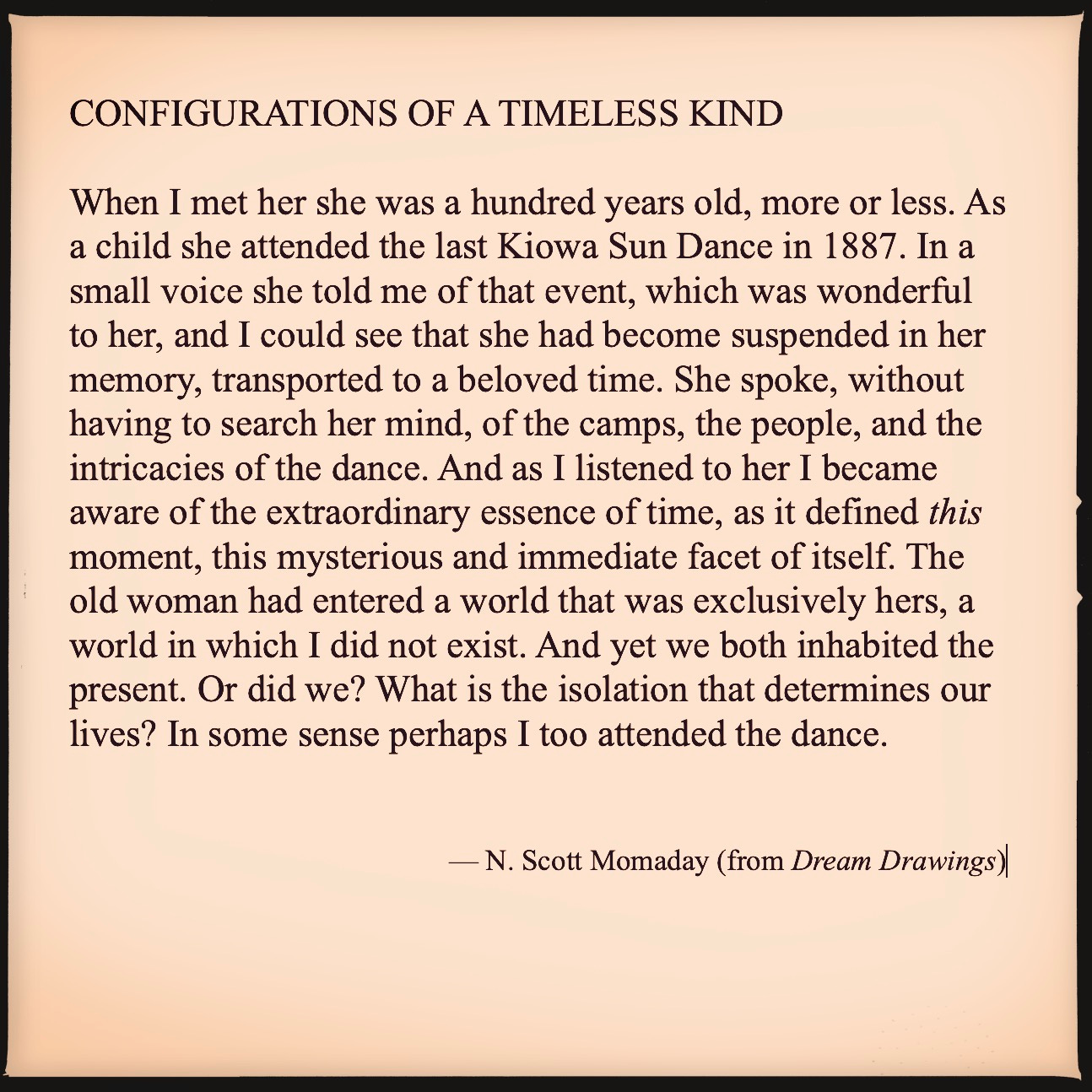 This showed up two days ago in the book of poetry I’m currently reading, Dream Drawings: Configurations of a Timeless Kind by N. Scott Momaday. It’s arrival influenced what I am writing today. It sums up perfectly how stories, when shared, make the listener as much a part of the event as the person relating the story. Or they can, anyway, if we listen. In these moments time, if it’s ever really even moving at all, stops….