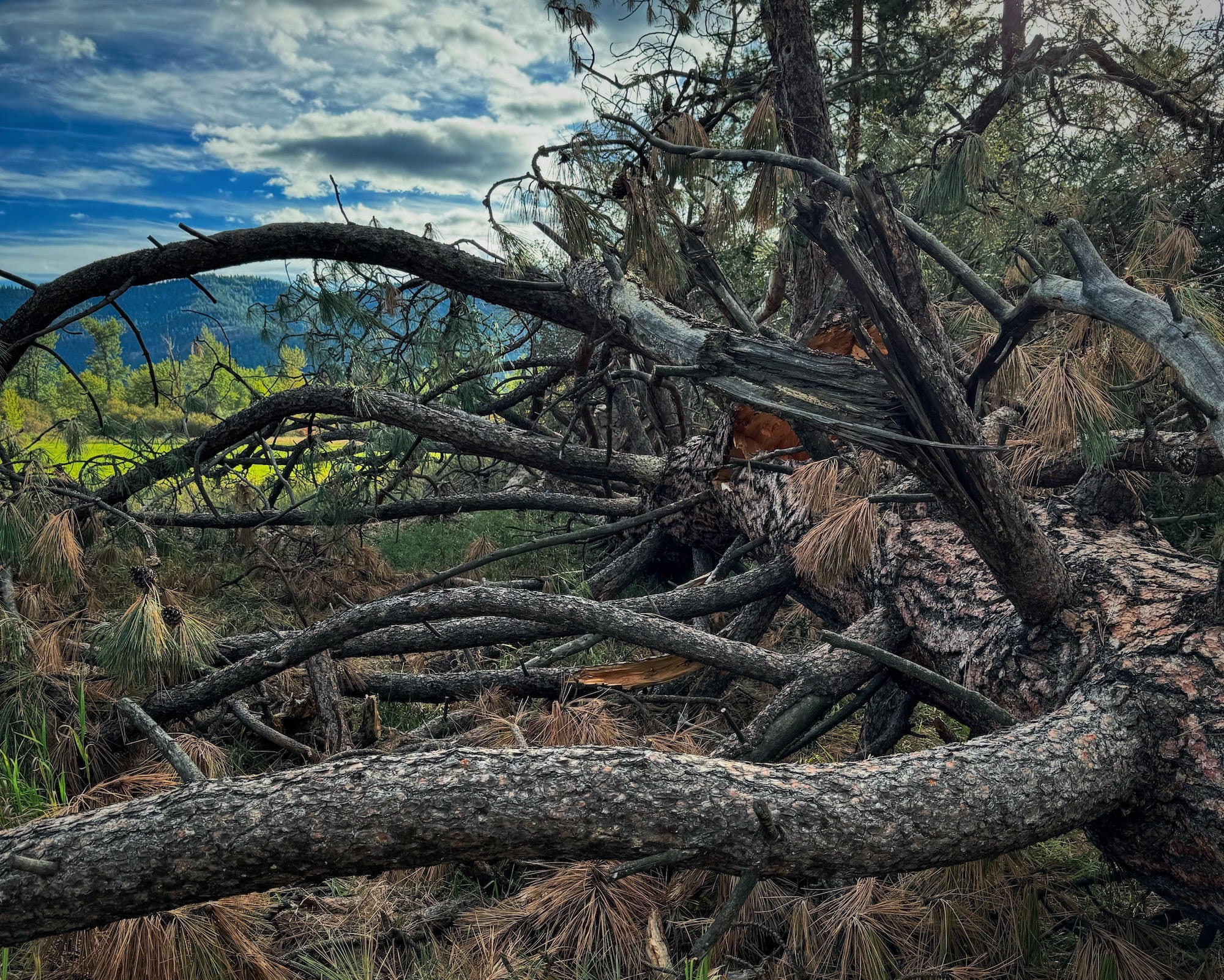 Sadly, the tree I love the most, the tree I would stop and visit every time I passed, did not survive. This was a massive and heavily-limbed old ponderosa pine who had been standing for easily the better part of three centuries. I don’t think three of me could have leaned against him and encompassed his girth with our outstretched hands. It was almost unimaginable to me to see this being who has been caressing the sky for as long as I have been visiting stretched now, broken and sawed-on, across the ground, the short span of trunk I have buried my face and nose into scores of times pressed down now into the soil.
